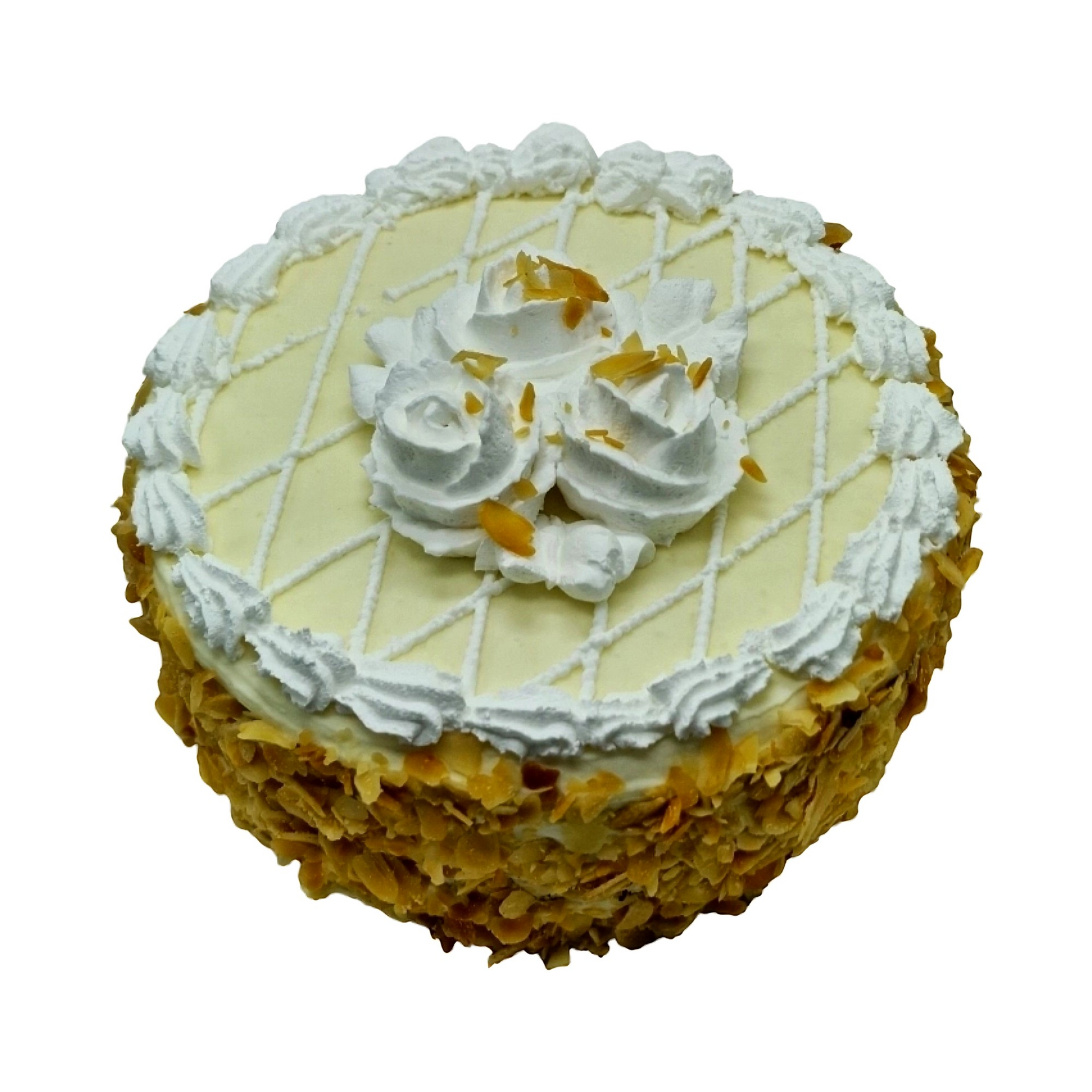 Три бисквита — маковый, с грецким орехом и с изюмом — чередуются со нежным сметанным кремом. Оформлен сливками; вкус домашний, тёплый и многослойно насыщенный.