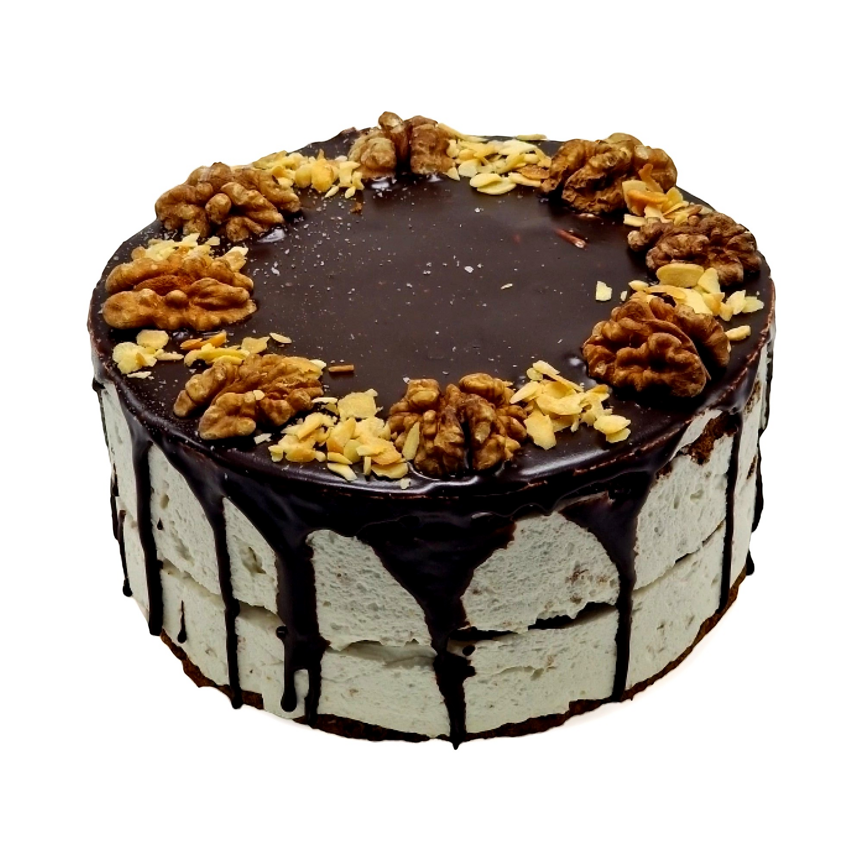Нежный бисквит на сгущённом молоке тает во рту; между слоями — воздушный сметанный крем с кусочками чернослива и хрустящими грецкими орехами и шоколадной глазурью собственного производства, верх украшен сметанным кремом и аккуратно посыпан какао — изысканно, по‑домашнему и аппетитно. Вес 1.5кг