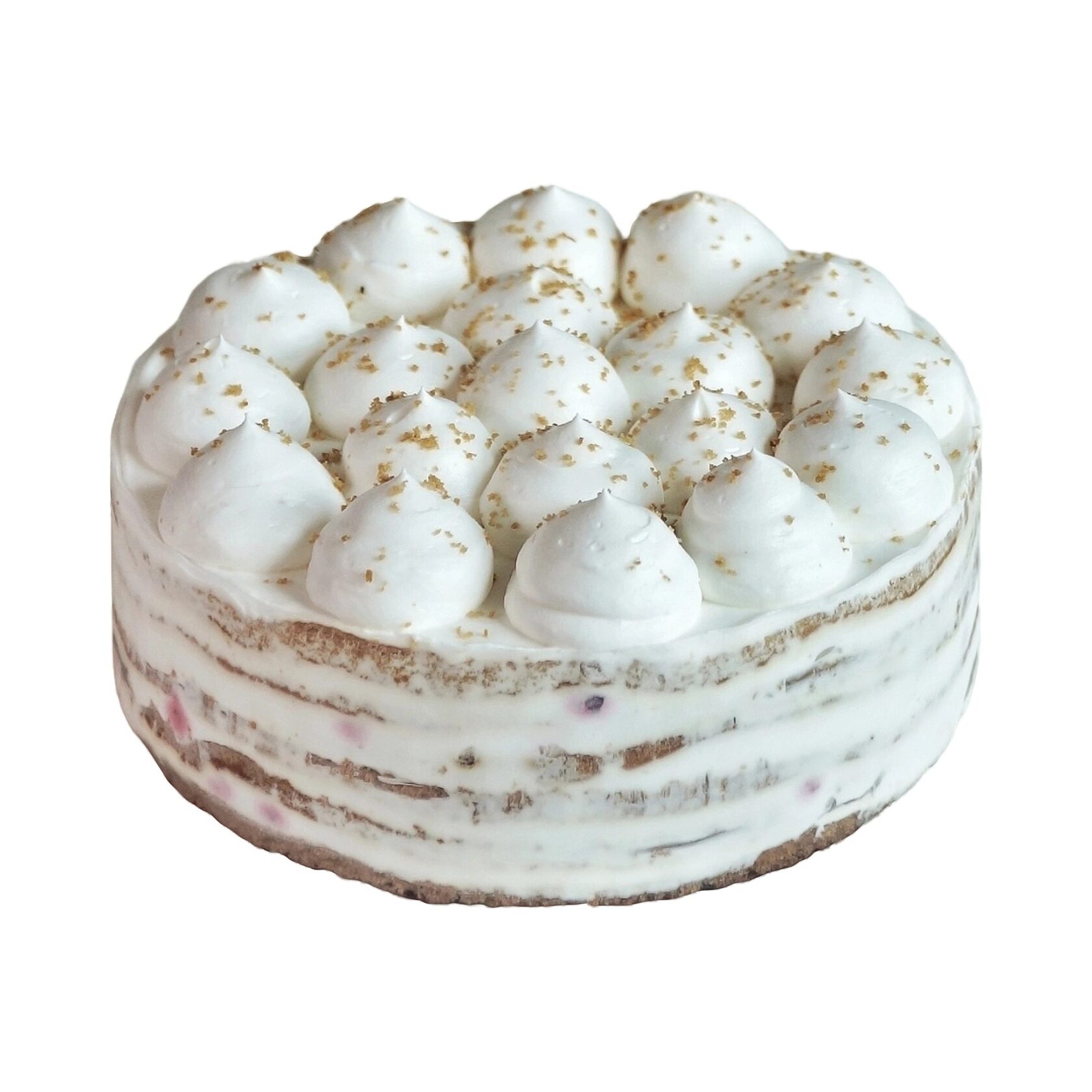 Нежный белый бисквит, прослоенный сливочным кремом с творожным сыром (чиз) и сочным малиновым конфи. Лёгкий, изящный и по‑домашнему нежный — идеален для праздника и уютного чаепития.